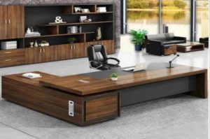 المكتب مصنوع من خشب عالي الجودة مع قاعدة معدنية متينة تضمن المتانة والدعْم، بينما الكرسي يتمتع بهيكل معدني مع تنجيد فاخر يوفر راحة استثنائية.