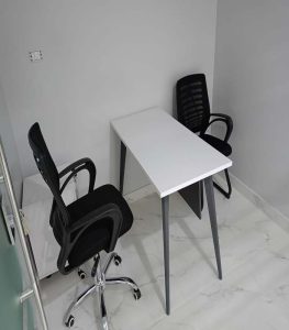 • الكراسي: تصميم عصري مع هيكل معدني وكراسي مريحة مبطنة بشبك مخصص لدعم الراحة.